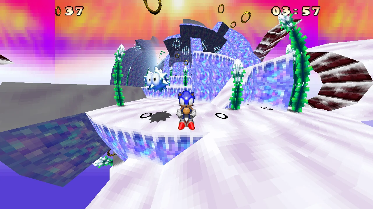 Sonic X-Treme Unity reconstructs those lost levels using the original prototype textures, color palettes, and layouts as reference. The signature fisheye camera is fully functional — everything curves and stretches around Sonic as he moves, creating a surreal sense of scale that no other Sonic fan game replicates. An optional camera filter darkens the screen to match the look of the original prototype footage even more closely.